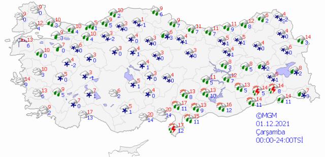 Meteoroloji'nin tahminlerine göre; çarşamba günü, Bilecik, Kütahya, Uşak, Eskişehir, Afyonkarahisar, Isparta, Burdur, Karaman, Niğde, Aksaray, Kayseri, Kırşehir, Nevşehir, Yozgat, Kırıkkale, Çorum, Çankırı, Kastamonu, Karabük, Amasya, Tokat, Sivas, Gümüşhane, Erzincan, Bayburt, Erzurum, Ardahan, Kars, Ağrı, Muş, Bitlis, Van, Hakkari ve Yozgat'ta kar yağışı etkili olacak. Perşembe günü ise Artvin, Ardahan, Kars, Iğdır, Erzurum, Ağrı, Muş, Bitlis ve Van'da kar yağışı bekleniyor.