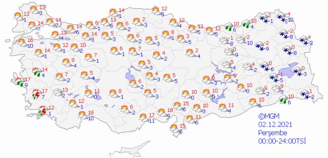 Parçalı ve çok bulutlu, güney ve batı kesimleri ile Erzurum ve Ağrı çevrelerinin yağmur ve sağanak yağışlı geçeceği tahmin ediliyor. Yağışların Erzurum'un yükseklerinde karla karışık yağmur ve yer yer kar şeklinde olması bekleniyor.