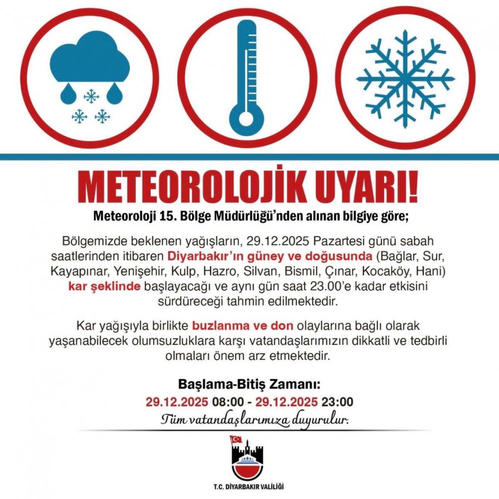 "Hafta sonu boyunca vilayetimiz genelinde etkili olan ve meteorolojik tahminlere göre sabah saatlerinden itibaren etkisini artıracak olan kar yağışı ve buzlanma riski nedeniyle vatandaşlarımızın ve çocuklarımızın güvenliği için bazı tedbirler alınmıştır. Bu kapsamda; 29 Aralık 2025 Pazartesi vilayetimiz genelinde resmî ve özel tüm örgün ve yaygın eğitim kurumları, rehabilitasyon merkezleri ile Kur'an kurslarında (yetişkinler hariç) eğitim ve öğretime 1 gün süreyle ara verilmiştir. Ayrıca; kreş ve anaokuluna devam eden çocuğu olan kadın personel ile (sağlık, güvenlik gibi 24 saat esasına göre hizmet veren birimlerde çalışan personelin durumu hizmetin gereği ilgili birimler tarafından değerlendirilerek planlanacaktır) malûl, engelli ve hamile kamu çalışanları da 1 (bir) gün idari izinli sayılacaktır. Vatandaşlarımızın dikkatli ve tedbirli olmalarını, zorunlu olmadıkça özel araçlarıyla trafiğe çıkmamalarını önemle rica ederiz"