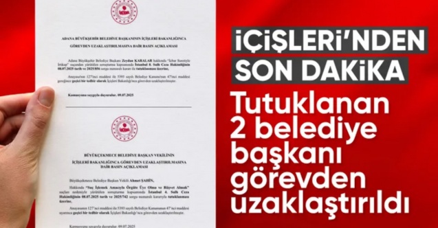 İçişleri Bakanlığı'ndan yapılan açıklamada Zeydan Karalar ve Büyükçekmece Belediye Başkan Vekili Ahmet Şahin, görevden uzaklaştırıldı.