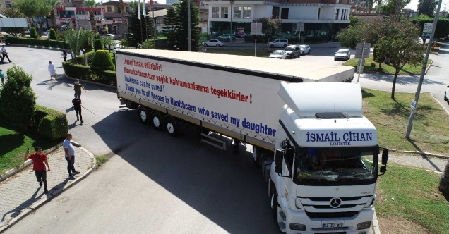 Adana’da 8 yıldır tedavi gördüğü lösemiden kurtulan 16 yaşındaki Rengin’in babası, tır dorsesine yazdırdığı yazıyla sağlık çalışanlarına teşekkür etti. İngilizce ve Türkçe yazılan yazıyla tüm dünyayı dolaşacağını söyleyen baba, herkesi kök hücre bağışına davet etti.