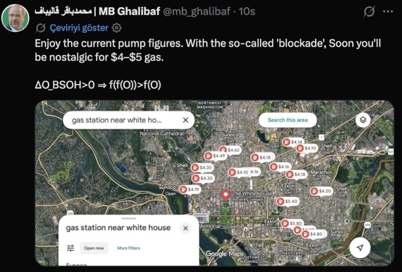 Beyaz Saray'ın çevresindeki akaryakıt istasyonlarının fiyatlarının göründüğü bir harita paylaşan Galibaf ABD'lileri en çok korkutan senaryoyu hatırlattı.