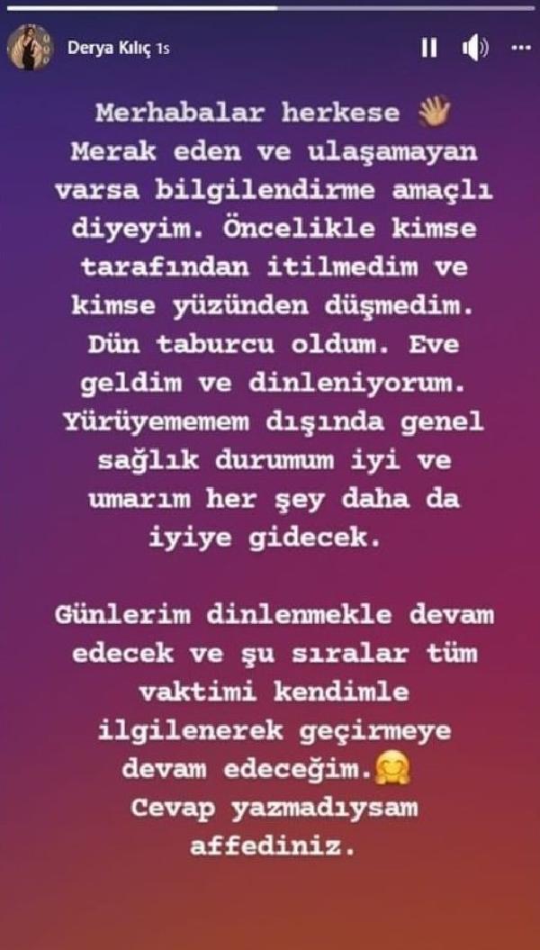 Mucize eseri ölümden dönen Kılıç, olayla ilgili ifade vermesi beklenen Derya Kılıç, sosyal medya hesabından yakınlarına bilgi vermek amacıyla paylaşımda bulundu, olayla ilgili bilgi verdi. Kılıç, yaptığı paylaşımda, "Öncelikle kimse tarafından itilmedim ve kimse yüzünden düşmedim. Dün taburcu oldum. Eve geldim ve dinleniyorum. Yürüyememem dışında genel sağlık durumum iyi ve umarım her şey daha da iyiye gidecek. Günlerim dinlenmekle devam edecek ve şu sıralar tüm vaktimi kendimle ilgilenerek devam edeceğim" ifadelerini kullandı.