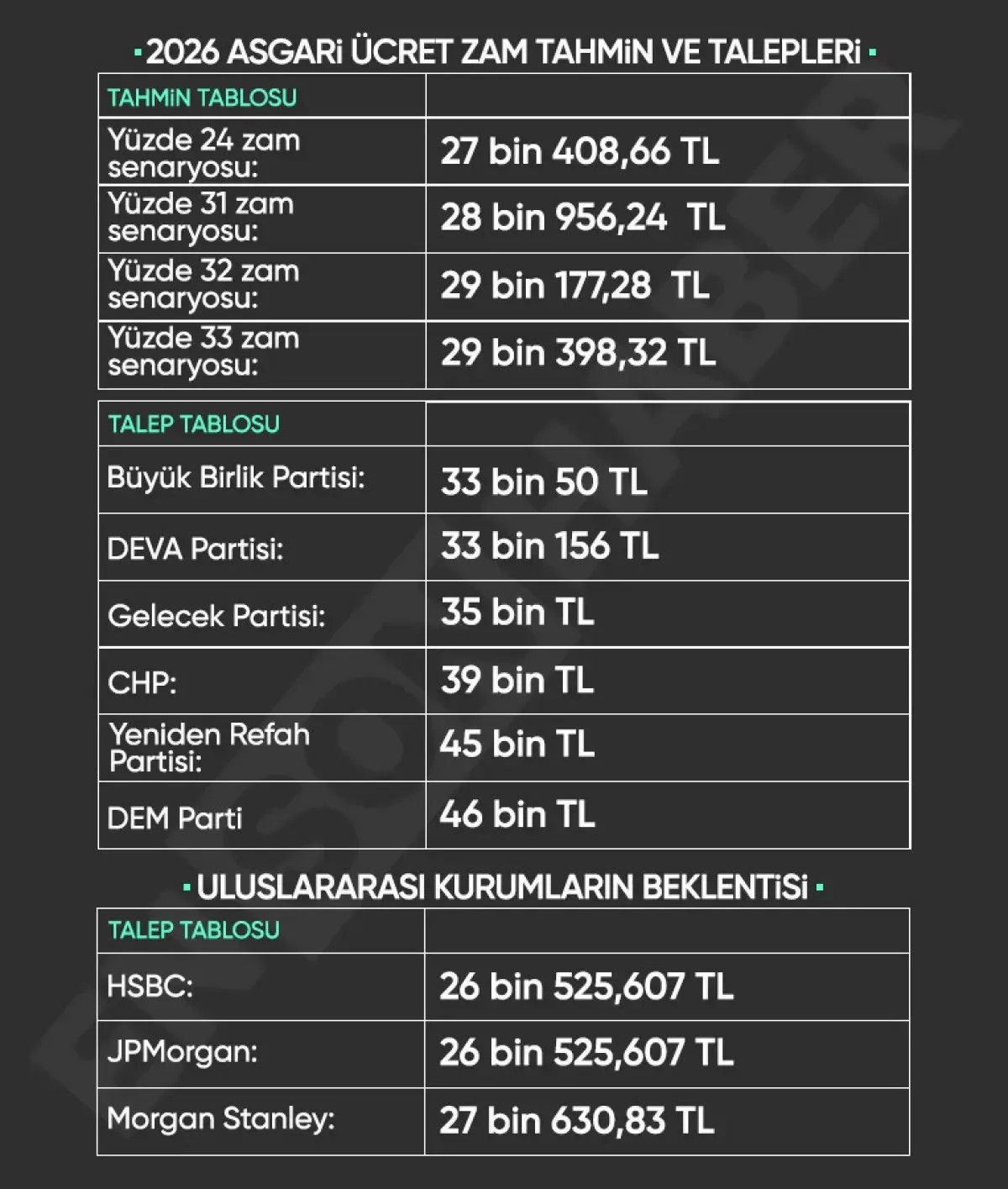 Farklı kesimler, 2026 yılı için yüzde 20 ila 46 arasında zam önerileri sunuyor ve karar 31 Aralık'a kadar duyurulacak.