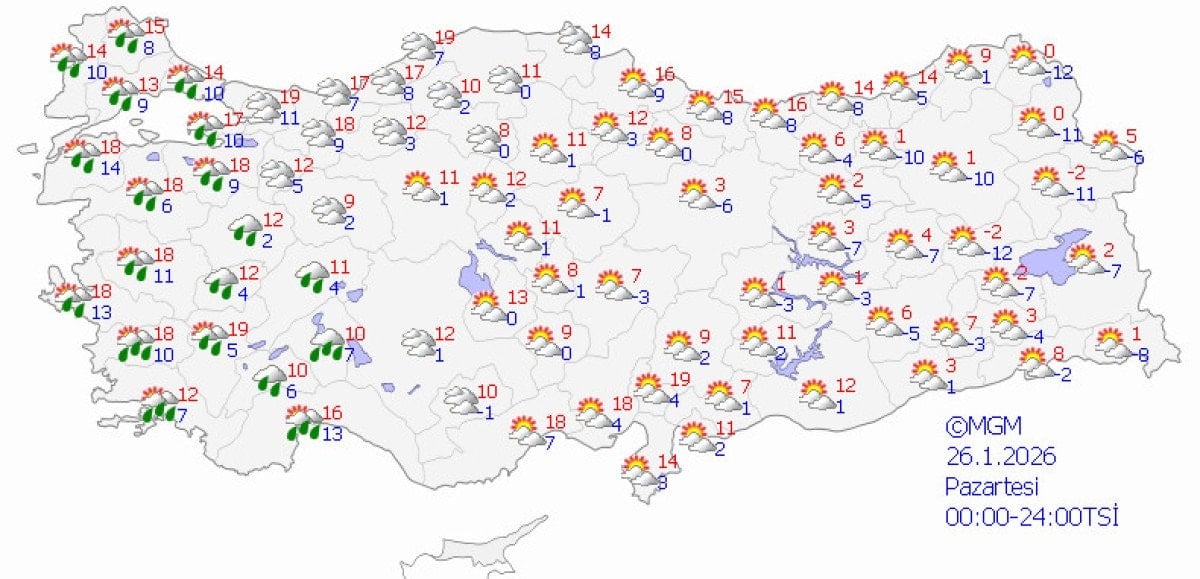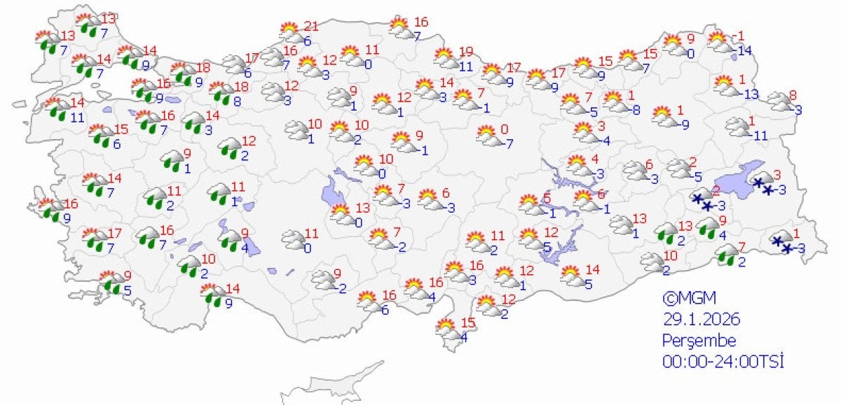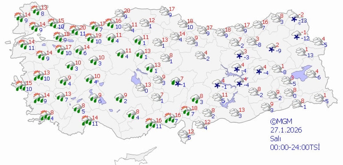 Sıcaklıkların genel olarak düşük; Doğu Anadolu'da -10 derecenin altına inen değerlerde görülmesi bekleniyor.