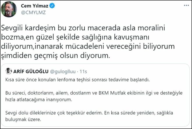 Yılmaz sosyal medyadan yaptığı paylaşımda, ‘’Sevgili kardeşim bu zorlu macerada asla moralini bozma, en güzel şekilde sağlığına kavuşmanı diliyorum, inanarak mücadeleni vereceğini biliyorum şimdiden geçmiş olsun diyorum’’ dedi.