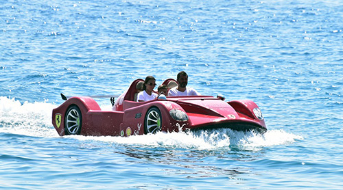 Antalya'nın Kemer ilçesine bağlı Tekirova beldesinde denizde Ferrari ile gezenleri görenler şaşkınlığını gizleyemiyorlar. Denizde Ferrari turunun 10 dakikası ise dudak uçuklatıyor. 10 dakika boyunca denizde Ferrari ile gezmek isteyenler 100 avro ücret ödüyor.