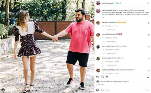 Berfu Yenenler de paylaşımında 1Tam dört sene önce bugün bu zamanlar el ele tutuşmuştuk hala el eleyiz. Dört sene binlerce ani iki güzel emmi oğlan sen ben. Ne güzel tek olmak bir de sonsuz olalım daha ne isterim' ifadelerine yer verdi. (AKŞAM)