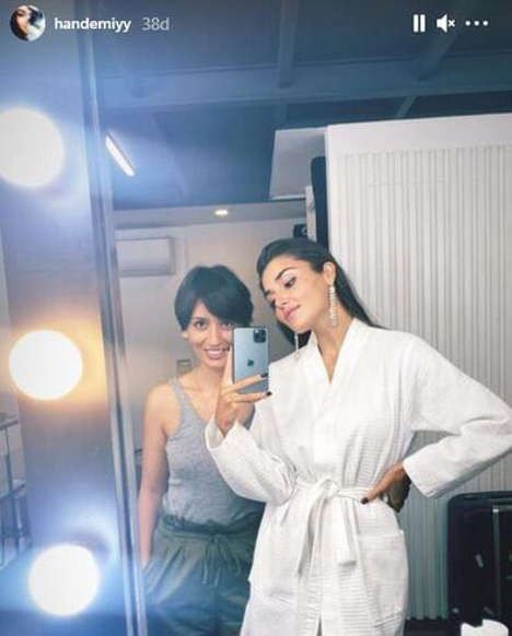 Arkadaşıyla ayna karşısına geçen Hande Erçel, bornozuyla poz verdi.