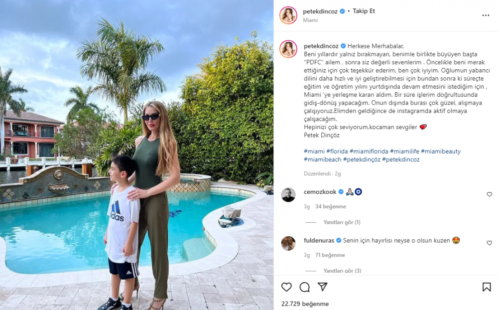 Geçtiğimiz ay Serkan Kodaloğlu ile 8 yıllık evliliğini bitiren Petek Dinçöz, Miami'ye taşınma kararı aldı. Sosyal medya hesabından paylaşım yapan Dinçöz, "Oğlumun dilini geliştirebilmesi için Miami'ye yerleşme kararı aldım" dedi.