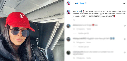 Inna, Instagram hesabında paylaştığı fotoğrafında “Bu fotoğrafta İstanbul’da olduğumu göstermeliydim. Ama olmadı. Türkiye’de bir yerde güvendeyim. Fakat yorgunum” dedi.