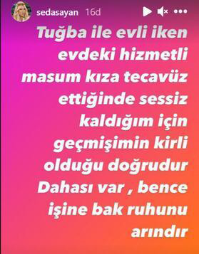 Kızgınlığı geçmeyen Seda Sayan, bu kez sosyal medya hesabından Erbil'e ağır bir suçlamada bulundu. Ünlü şovmenin evdeki hizmetlisine tecavüz ettiğini belirten Seda Sayan "Tuğba ile evliyken evdeki hizmetli kıza tecavüz ettiğinde sessiz kaldığım için geçmişimin kirli olduğu doğrudur. Dahası var bence işine bak ruhunu arındır" yazdı.