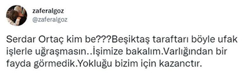 Fanatik Beşiktaşlı Zafer Algöz'den ünlü şarkıcıya tepki geldi. Ünlü oyuncu, "Serdar Ortaç kim? Beşiktaş taraftarı böyle ufak işlerle uğraşmasın. İşimize bakalım. Varlığından bir fayda görmedik. Yokluğu bizim için kazançtır" ifadelerini kullandı.