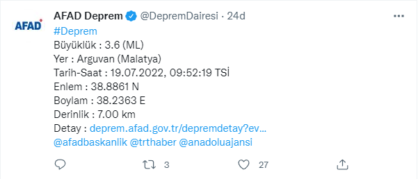Kandilli ve AFAD son depremler tablosuna göre Merkez üssü Arguvan ilçesi olan depremin büyüklüğü ise 3.4 olarak kaydedildi. İşte Kandilli ve AFAD son depremler tablosu...