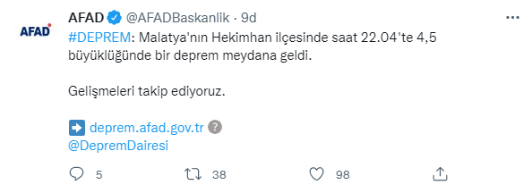 AFAD Malatya'da 4.5 büyüklüğünde bir deprem meydana geldiğini duyurdu.