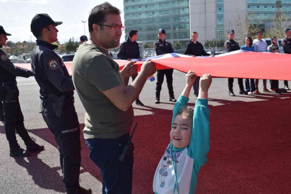 Solo Türk ve Türk Yıldızları İl Emniyet Müdürlüğü yerleşkesi üzerinden de geçiş yaparken, İl Emniyet Müdürü Ercan Dağdeviren’in de katılımıyla dev Türk bayrağı açıldı.