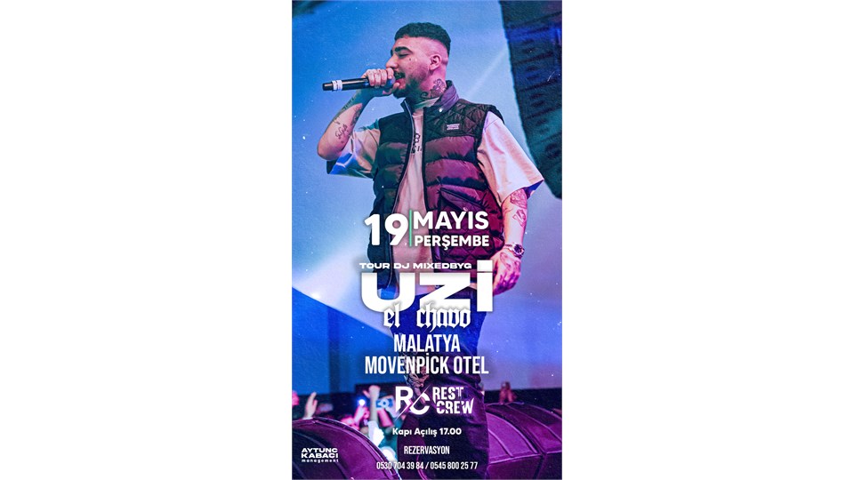 Uzi, 19 Mayıs'ta Möpenpick Hotel Malatya'da hayranlarıyla buluşacak. Biletlerinizi biletix.com 'dan alabilirsiniz. Bilet fiyatları Sahne Önü - 239.00 TL, Normal Giriş - 169.00 TL