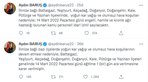 Vali Aydın Baruş, sosyal medya hesabından yaptığı açıklamada, “İlimize bağlı bazı ilçelerde yoğun kar yağışı ve olumsuz hava koşullarının devam etmesi nedeniyle; Battalgazi, Yeşilyurt, Akçadağ, Doğanşehir, Doğanyol, Kale, Pütürge ve Yazıhan İlçeleri genelinde 14 Mart 2022 Pazartesi günü eğitime 1 (bir) gün ara verilmesine karar verilmiştir.” açıklamasıyla tatili duyurdu.