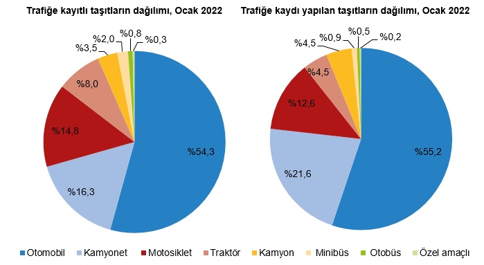 Ocak ayında trafiğe kaydı yapılan taşıtların yüzde 55,2'sini otomobil, yüzde 21,6'sını kamyonet, yüzde 12,6'sını motosiklet, yüzde 4,5'ini kamyon, yüzde 4,5'ini traktör, yüzde 0,9'unu minibüs, yüzde 0,5'ini otobüs ve yüzde 0,2'sini özel amaçlı taşıtlar oluşturdu.