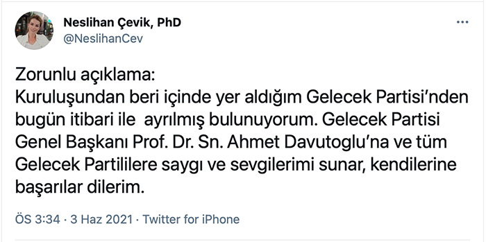 Gelecek Partisi Genel Başkan Yardımcısı Neslihan Çevik, istifasına ilişkin açıklamayı Twitter hesabından yaptı.