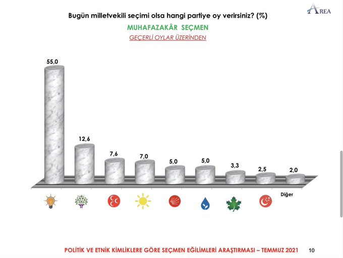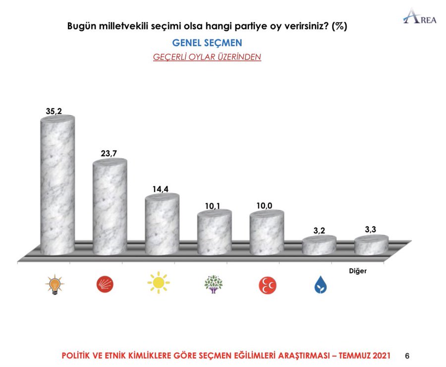 Area Araştırma'nın temmuz ayında gerçekleştirdiği anket çalışmasına göre AKP'nin oyları yüzde 35,2'ye geriledi. Cumhur İttifakı'nın diğer ortağı MHP ise yüzde 10'luk oy oranı ile seçim barajı sınırında yer aldı. CHP'nin yüzde 23,7 oy aldığı ankette, İyi Parti'nin oy oranı yüzde 14,4 olarak hesaplandı.