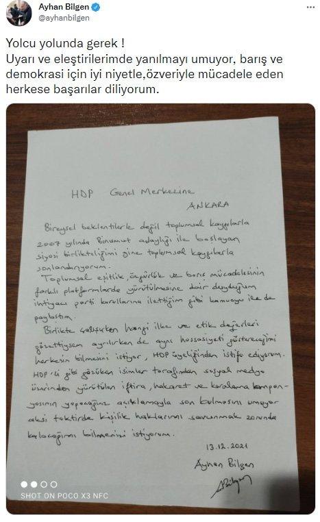 Bir süredir HDP ile siyaset yürütmenin zorluklarını dile getiren HDP'li Ayhan Bilgen, partisinden istifa ettiğini duyurdu. Sosyal medya hesabından açıklama yapan Bilgen, şunları ifade etti: