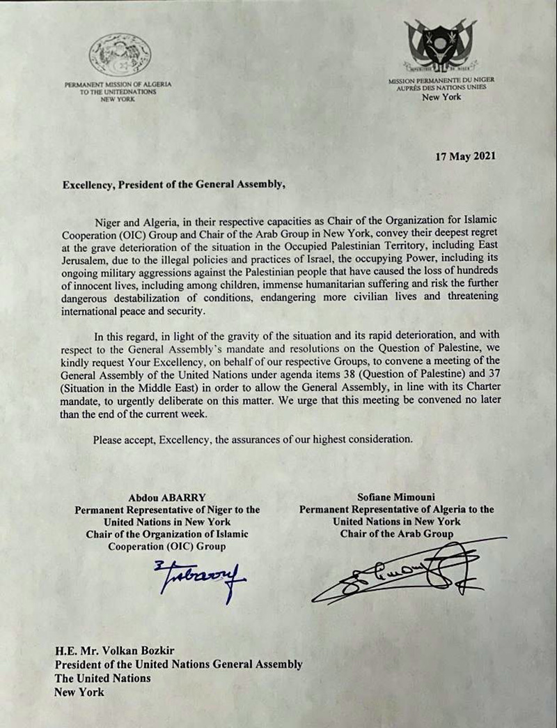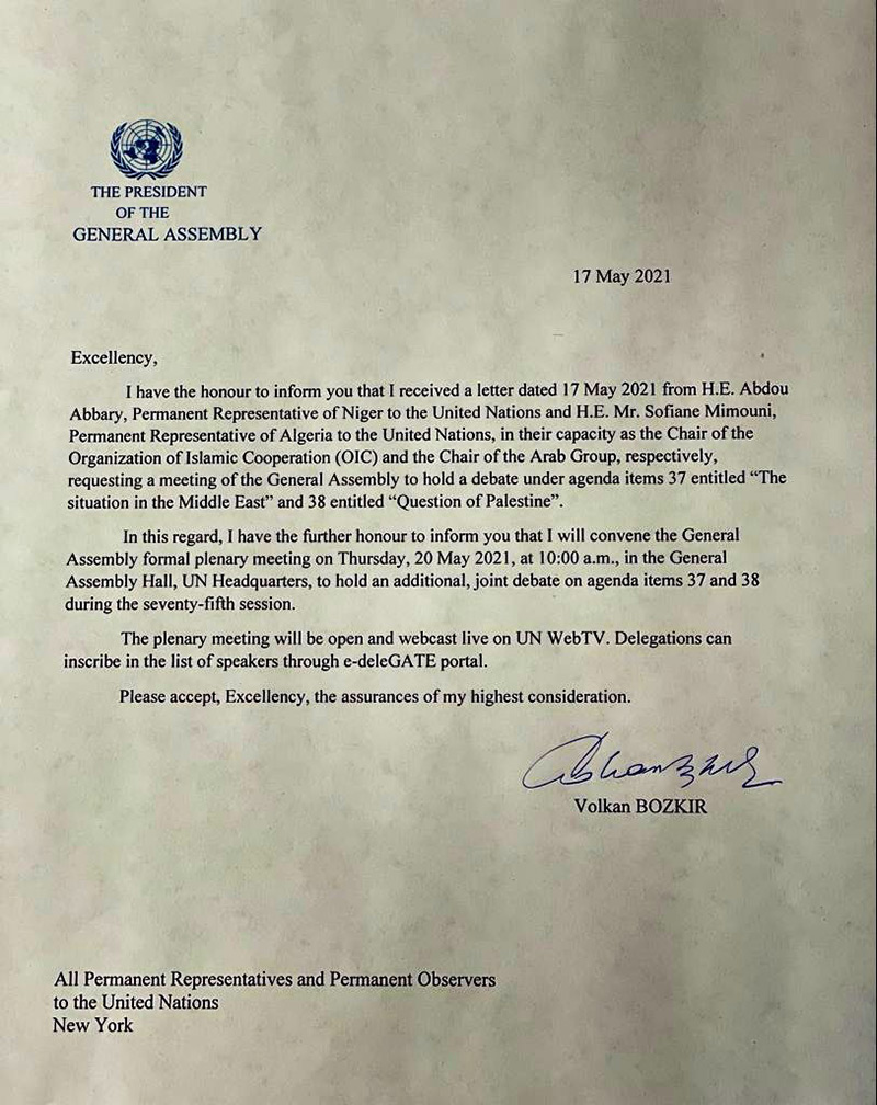 BM 75. Genel Kurulu Başkanı Volkan Bozkır, sosyal medya hesabından yaptığı açıklamada İsrail işgali altındaki Filistin topraklarının durumunun görüşülmesi adına BM Genel Kurulunu 20 Mayıs Perşembe günü saat 10.00'da ABD'nin New York eyaletinde yer alan BM merkez binasında toplama kararı aldığını belirtti. Bozkır, "BM Genel Kurulu’nu, İslam İşbirliği Teşkilatı adına Nijer ve Arap Grubu adına Cezayir Daimi Temsilcilerinin ortak imzalı mektubunda yer alan talebe binaen, işgal altındaki Filistin topraklarındaki vahim durumu görüşmek üzere 20 Mayıs Perşembe günü saat 10.00'da toplayacağım" ifadelerini kullandı.