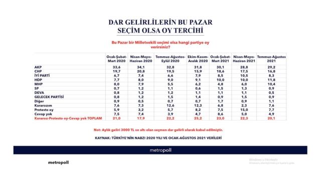 AK PARTİ BİRİNCİ OLDUAnket sonuçlarına göre tüm aylarda AK Parti, dar gelirli vatandaşların en çok tercih ettiği parti oldu. AK Parti'yi sırasıyla CHP, HDP, İYİ Parti ve MHP takip etti.TEMMUZ - AĞUSTOS'TA YÜZDE 29.2AK Parti, Temmuz- Ağustos ayı içerisinde yüzde 29.2 ile listenin zirvesinde yer aldı. Aynı ay içerisinde AK Parti'yi yüzde 16.8 ile CHP, yüzde 11.8 ile HDP, yüzde 10.4 ile MHP ve yüzde 8.3 ile İYİ Parti takip etti. Kararsızların oranı da yüzde 20.1 olarak kayıtlara geçti.
