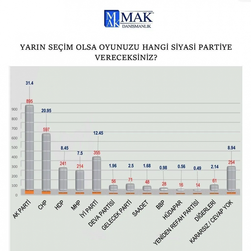 MAK Danışmanlık'tan anket çalışmasına ilişkin, "Kamuoyu araştırmaları araştırmayı yapanların gönlünde geçen sonuçları değil çalışmaya katılan katılımcının verdiği cevapları yansıtır. Kararsizların matematiksel dağılımı fikir verme amaçlıdır. Diğerleri başlığı altında yeni partiler ağırlıklı dağılım vardır" denildi.