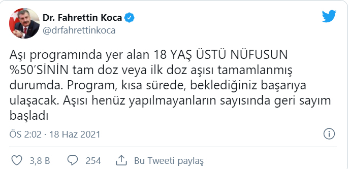Sağlık Bakanı Fahrettin Koca, "Aşı programında yer alan 18 YAŞ ÜSTÜ NÜFUSUN %50’SİNİN tam doz veya ilk doz aşısı tamamlanmış durumda. Program, kısa sürede, beklediğiniz başarıya ulaşacak. Aşısı henüz yapılmayanların sayısında geri sayım başladı" açıklamasında bulundu