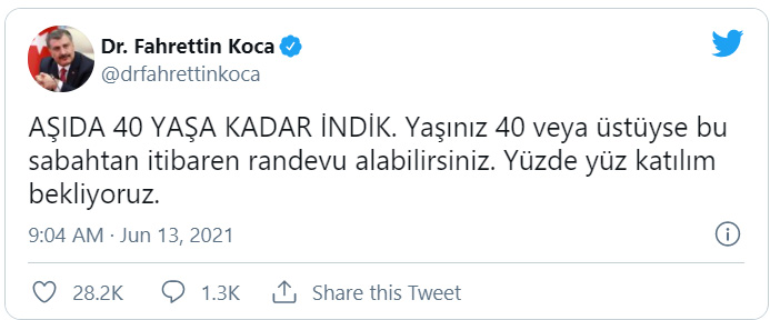 Sağlık Bakanı Fahrettin Koca, Twitter hesabından yaptığı paylaşımda, aşılamada yaşı 40'a kadar indirdiklerini belirtti.