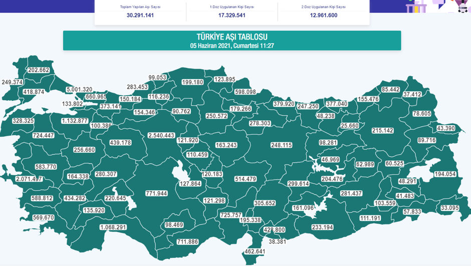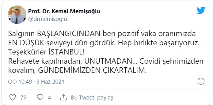 İstanbul'da uygulanan birinci ve ikinci doz toplam aşı miktarı 5 milyonu geçti. İstanbul İl Sağlık Müdürü Prof. Dr. Kemal Memişoğlu, Twitter hesabından yaptığı paylaşımda, "Salgının başlangıcından beri pozitif vaka oranımızda en düşük seviyeyi dün gördük. Hep birlikte başarıyoruz. Teşekkürler İstanbul! Rehavete kapılmadan, unutmadan. Covid'i şehrimizden kovalım, gündemimizden çıkartalım" dedi.