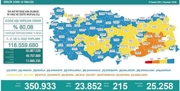 Sağlık Bakanlığı tarafından açıklanan tabloda, 2 doz aşılama verilerine de yer verildi. En az 2 doz aşı olmuş 18 yaş üzeri nüfusu kapsayan verilere göre Türkiye'de 2. doz aşılama ortalama yüzde 80,08 oldu. 1. doz ortalaması yüzde 90,01 olurken, 1., 2. ve 3. doz aşısını olan vatandaş sayısı toplamda 118 milyon 559 bin 680 ’e yükseldi.