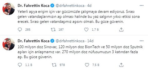 Bakan Koca, paylaşımında "100 milyon doz Sinovac, 120 milyon doz BionTech ve 50 milyon doz Sputnik aşıları için anlaşmamız var. 270 milyon doz nüfusumuzun 3 katından fazla aşı. Bu güce güvenin." ifadelerine yer verdi.