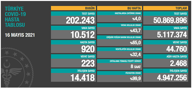 Sağlık Bakanlığının Covid-19 bilgilendirme sayfasında Türkiye’nin güncel korona virüs tablosu kamuoyuyla paylaşıldı. Tabloya göre, son 24 saatte 223 kişi korona virüsten hayatını kaybetti, toplam can kaybı 44 bin 760’a yükseldi. Toplamda 50 milyon 869 bin 896 test yapıldı. Bugün yapılan 202 bin 243 testten, 10 bin 512 yeni vaka sayısı, 920 kişi de yeni hasta sayısı olduğu belirtildi. Toplam vaka sayısının 5 milyon 117 bin 374 olduğu, bugün iyileşen 14 bin 418 kişiyle birlikte toplam iyileşen hasta sayısının 4 milyon 947 bin 256’e yükseldiği, toplam hastalarda zatürre oranının yüzde 4,0, ağır hasta sayısının ise 2 bin 468 olduğu açıklandı.