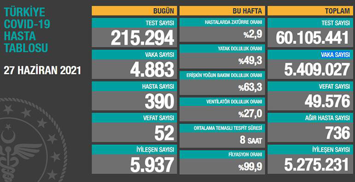 Sağlık Bakanlığının Covid-19 bilgilendirme sayfasında Türkiye’nin güncel korona virüs tablosu kamuoyuyla paylaşıldı. Tabloya göre son 24 saatte 52 kişi korona virüsten hayatını kaybetti, toplam can kaybı 49 bin 576’ya yükseldi. Toplamda 60 milyon 105 bin 441 test yapıldı. Bugün yapılan 215 bin 294 testten 4 bin 883 yeni vaka sayısı, 390 de yeni hasta sayısı olduğu belirtildi. Toplam vaka sayısının 5 milyon 409 bin 27, bugün iyileşen 5 bin 937 kişiyle toplam iyileşen hasta sayısının 5 milyon 275 bin 231’e yükseldiği, toplam hastalarda zatürre oranının yüzde 2,9, ağır hasta sayısının ise 736 olduğu açıklandı.
