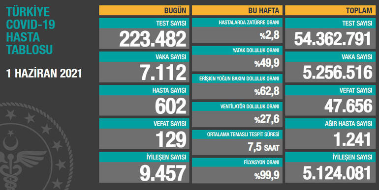 Sağlık Bakanlığının Covid-19 bilgilendirme sayfasında Türkiye’nin güncel korona virüs tablosu kamuoyuyla paylaşıldı. Tabloya göre son 24 saatte 129 kişi korona virüsten hayatını kaybetti, toplam can kaybı 47 bin 656’a yükseldi. Toplamda 54 milyon 362 bin 791 test yapıldı. Bugün yapılan 223 bin 482 testten, 7 bin 112 yeni vaka sayısı, 602 kişi de yeni hasta sayısı olduğu belirtildi. Toplam vaka sayısının 5 milyon 256 bin 516 olduğu, bugün iyileşen 9 bin 457 kişiyle birlikte toplam iyileşen hasta sayısının 5 milyon 124 bin 81’e yükseldiği, toplam hastalarda zatürre oranının yüzde 2,8, ağır hasta sayısının ise bin 241 olduğu açıklandı.