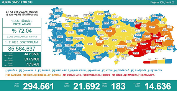 Sağlık Bakanlığı tarafından Türkiye'nin yeni korona virüs tablosu açıklandı. 17 Ağustos’ta açıklanan 24 saatlik verilere göre 21 bin 692 vaka tespit edildi. Virüs nedeniyle hayatını kaybedenlerin sayısı 183 oldu. Bir günde toplam 294 bin 561 test yapılırken, iyileşen hasta sayısı 14 bin 636 olarak kaydedildi. Sağlık Bakanlığı tarafından açıklanan tabloda, aşılama verilerine de yer verildi. En az 1 doz aşı olmuş 18 yaş üzeri nüfusu kapsayan verilere göre Türkiye'de 1. doz aşılama ortalama yüzde 72,04 oldu. 2. doz ortalaması yüzde 54,42 olurken, 1., 2. ve 3. doz aşısını olan vatandaş sayısı toplamda 85 milyon 564 bin 637’e yükseldi.