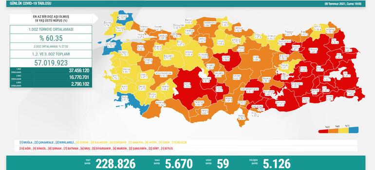 Sağlık Bakanlığı tarafından Türkiye'nin yeni korona virüs tablosu açıklandı. 9 Temmuz'da açıklanan 24 saatlik verilere göre 5 bin 670 vaka tespit edildi. Virüs nedeniyle hayatını kaybedenlerin sayısı 59 oldu. Bir günde toplam 228 bin 826 test yapılırken, iyileşen hasta sayısı 5 bin 126 olarak kaydedildi. Sağlık Bakanlığı tarafından açıklanan tabloda, aşılama verilerine de yer verildi. En az 1 doz aşı olmuş 18 yaş üzeri nüfusu kapsayan verilere göre Türkiye'de 1. doz aşılama ortalama yüzde 60,35 oldu. 2. doz ortalaması yüzde 27,02 olurken, 1., 2. ve 3. doz aşısını olan vatandaş sayısı toplamda 57 milyon 19 bin 923'e yükseldi.