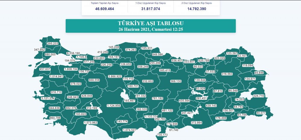 26 Haziran 2021 saat 12.25 itibari ile Türkiye' de toplam kaç doz aşı vuruldu işte sonuçlar;