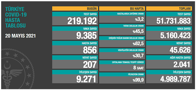 Sağlık Bakanlığının Covid-19 bilgilendirme sayfasında Türkiye’nin güncel korona virüs tablosu kamuoyuyla paylaşıldı. Tabloya göre son 24 saatte 207 kişi korona virüsten hayatını kaybetti, toplam can kaybı 45 bin 626’a yükseldi. Toplamda 51 milyon 731 bin 883 test yapıldı. Bugün yapılan 219 bin 192 testten, 9 bin 385 yeni vaka sayısı, 856 kişi de yeni hasta sayısı olduğu belirtildi. Toplam vaka sayısının 5 milyon 160 bin 423 olduğu, bugün iyileşen 9 bin 271 kişiyle birlikte toplam iyileşen hasta sayısının 4 milyon 989 bin 787’e yükseldiği, toplam hastalarda zatürre oranının yüzde 3,2, ağır hasta sayısının ise 2 bin 41 olduğu açıklandı.