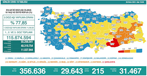 Sağlık Bakanlığı tarafından Türkiye'nin yeni korona virüs tablosu açıklandı 26 Ekim’de açıklanan 24 saatlik verilere göre 29 bin 643 vaka tespit edildi. Virüs nedeniyle hayatını kaybedenlerin sayısı 215 oldu. Bir günde toplam 356 bin 636 test yapılırken, iyileşen hasta sayısı 31 bin 467 olarak kaydedildi. Sağlık Bakanlığı tarafından açıklanan tabloda, 2 doz aşılama verilerine de yer verildi. En az 2 doz aşı olmuş 18 yaş üzeri nüfusu kapsayan verilere göre Türkiye'de 2. doz aşılama ortalama yüzde 77,85 oldu. 1. doz ortalaması yüzde 89,02 olurken, 1., 2. ve 3. doz aşısını olan vatandaş sayısı toplamda 115 milyon 674 bin 594 ’e yükseldi.