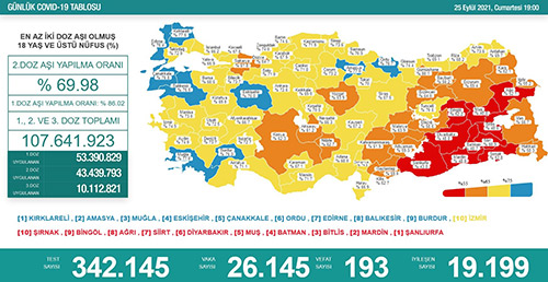 Sağlık Bakanlığı tarafından Türkiye'nin yeni korona virüs tablosu açıklandı 25 Eylül’de açıklanan 24 saatlik verilere göre 26 bin 145 vaka tespit edildi. Virüs nedeniyle hayatını kaybedenlerin sayısı 193 oldu. Bir günde toplam 342 bin 145 test yapılırken, iyileşen hasta sayısı 19 bin 199 olarak kaydedildi. Sağlık Bakanlığı tarafından açıklanan tabloda, 2 doz aşılama verilerine de yer verildi. En az 2 doz aşı olmuş 18 yaş üzeri nüfusu kapsayan verilere göre Türkiye'de 2. doz aşılama ortalama yüzde 69,98 oldu. 1. doz ortalaması yüzde 86,02 olurken, 1., 2. ve 3. doz aşısını olan vatandaş sayısı toplamda 107 milyon 641 bin 923’e yükseldi.