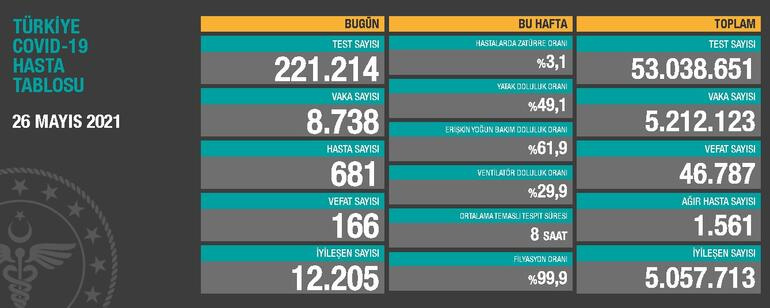 Sağlık Bakanlığının Covid-19 bilgilendirme sayfasında Türkiye’nin güncel korona virüs tablosu kamuoyuyla paylaşıldı. Tabloya göre son 24 saatte 166 kişi korona virüsten hayatını kaybetti, toplam can kaybı 46 bin 787’a yükseldi. Toplamda 53 milyon 38 bin 651 test yapıldı. Bugün yapılan 221 bin 214 testten, 8 bin 738 yeni vaka sayısı, 681 kişi de yeni hasta sayısı olduğu belirtildi. Toplam vaka sayısının 5 milyon 212 bin 123 olduğu, bugün iyileşen 12 bin 205 kişiyle birlikte toplam iyileşen hasta sayısının 5 milyon 57 bin 713’e yükseldiği, toplam hastalarda zatürre oranının yüzde 3,1, ağır hasta sayısının ise bin 561 olduğu açıklandı.
