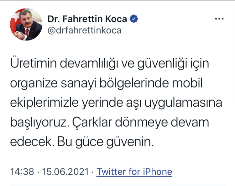 Sağlık Bakanı Fahrettin Koca yeni yaptığı açıklamada yerinde aşı uygulamasının başladığını duyurdu. Koca, "Üretimin devamlılığı ve güvenliği için organize sanayi bölgelerinde mobil ekiplerimizle yerinde aşı uygulamasına başlıyoruz. Çarklar dönmeye devam edecek. Bu güce güvenin" dedi.