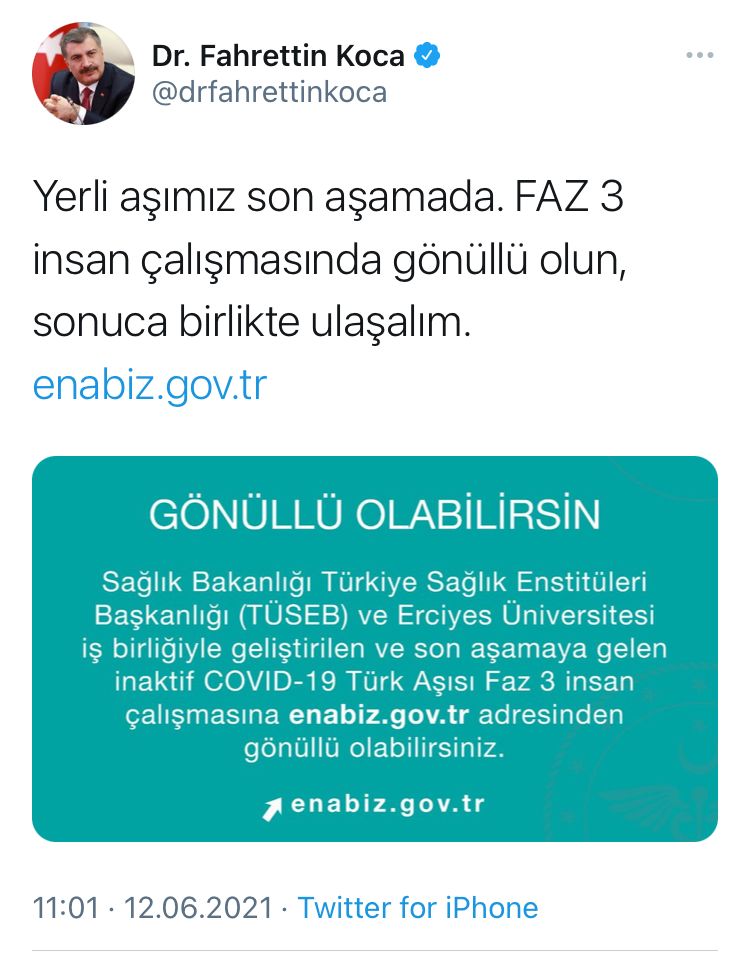 "Sağlık Bakanlığı Türkiye Sağlık Enstitüleri Başkanlığı (TÜSEB) ve Erciyes Üniversitesi iş birliğiyle geliştirilen ve son aşamaya gelen inaktif Covid-19 Türk aşısı Faz 3 insan çalışmasına enabiz.gov.tr adresinden gönüllü olabilirsiniz"