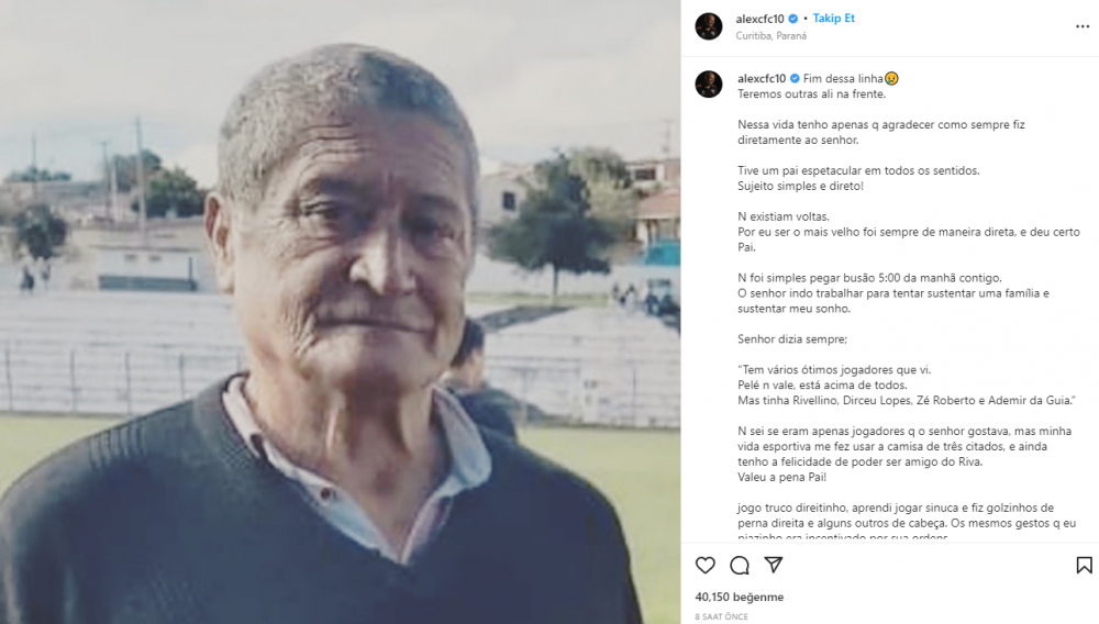 Fenerbahçe'nin efsane futbolcusu Alex De Souza, babasının yaşamını yitirdiğini duyurdu.