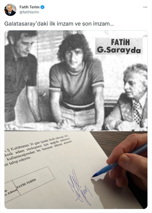 Sarı-kırmızılı takımla yollarını ayıran Teknik Direktör Fatih Terim, günler sonra sosyal medya hesabından bir paylaşım yaptı. Sarı-kırmızılı kulübe attığı ilk imza ve attığı son imzanın fotoğraflarını koyan Terim, "Galatasaray'daki ilk imzam ve son imzam" notunu düştü.