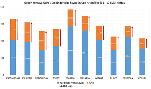 Sağlık Bakanı Koca, sosyal paylaşım sitesi Twitter hesabından yaptığı paylaşımda, “11-17 Eylül arasında, 100.000 kişi içinde bir haftalık toplam yeni Covid-19 vaka sayısı neydi? Yaşadığınız, gidip geldiğiniz ildeki durumu haftalık insidans haritamızdan öğrenebilirsiniz. 11-17 Eylül arasında vaka yoğunluğu bir önceki haftaya göre en çok artan 10 ilimiz: Kastamonu, Kırıkkale, Zonguldak, Tokat, Trabzon, Malatya, Yozgat, Düzce, Erzincan, Çorum! Bu illerden birindeyseniz şimdi daha da dikkatli olmalısınız. Nihai çözüm aşı, tedbirler şart” dedi.