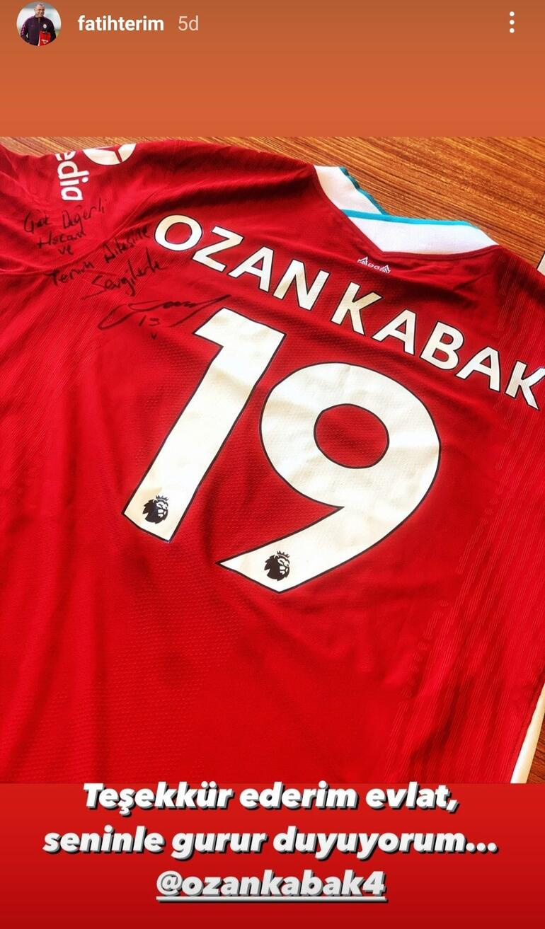 Milli futbolcu Ozan Kabak, Galatasaray'dan hocası Fatih Terim'e imzalı Liverpool forması gönderdi. Ozan formaya; "Çok değerli Hocam ve Terim ailesine sevgilerle" mesajı yazdı.